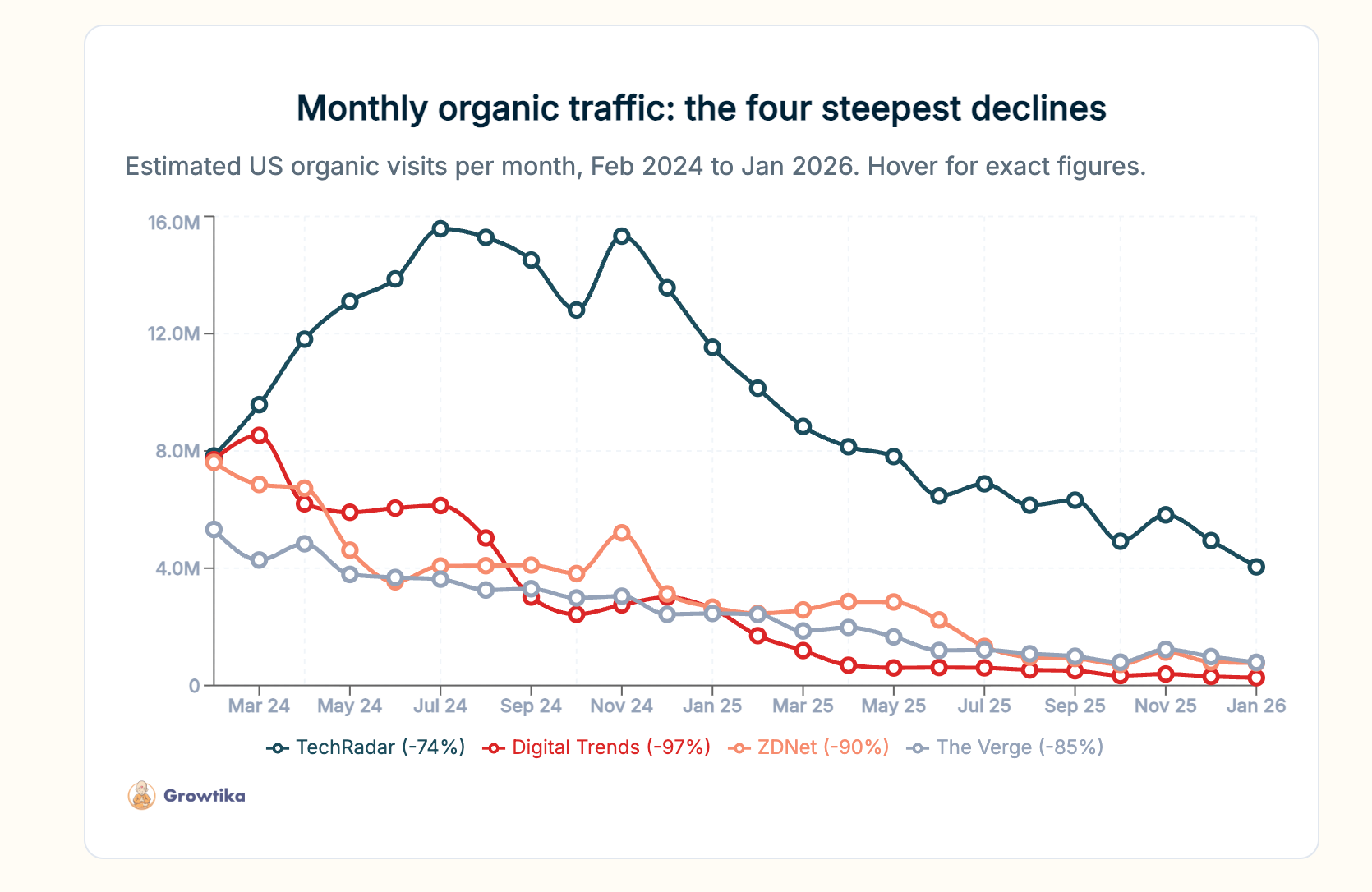 Several former colleagues have been citing this article from SEO agency Growtika, showing the severe dropoff in unique visitors for 10 top tech media brands from their mid-2020’s peaks to the end of 2025. The title: “Tech Media Traffic Collapse,” should be enough to clue you in to what it shows.